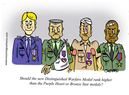 OK, its time to put this thing into perspective. Yes, drone pilots deserve their own medal. Should it outrank the Purple Heart or Bronze Star … of course not. Keep in mind these guys do “play video games” for a living but they also press the button that takes a lfe when called for … no small thing. Yes there is stress related to their job. However, they remain safe no matter what. They are not being shot at or have boots on the ground enduring alll the stress that brings to the table.