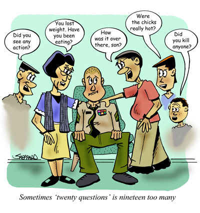 When you get back, the last thing you want to do is play “Twenty Questions.” People mean well but there’s a time and place for everything. Let me just relish in the fact I am home and safe. I’ll come around, just give me some space. Be there when I’m ready to chat about it.