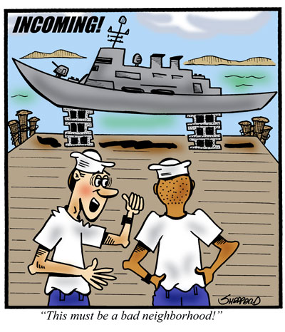 Man, I’d hate to see the arms on the guy that jacked that ship up! When doodling, I was thinking of a ship in drydock and how they got it up. So I kind of stretched that into using car jacks … then I thought of cars up on cement blocks and there you have it. The formula for this cartoon.