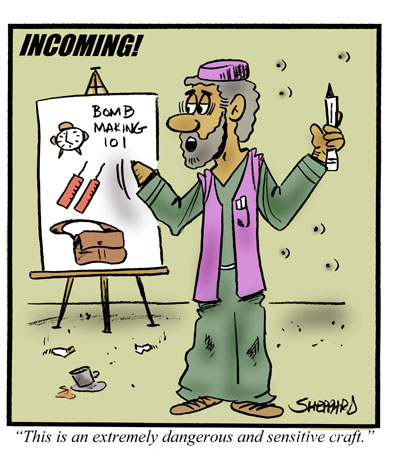 I think if I were a terrorist attending a bomb making class, I’d be leary of the teacher with one hand! Hmmm … I guess he either was caught stealing and had his hand “surgically” removed, or he goofed on a previous bomb effort. Neither case gives me that warm and comfortable feeling in a teacher.