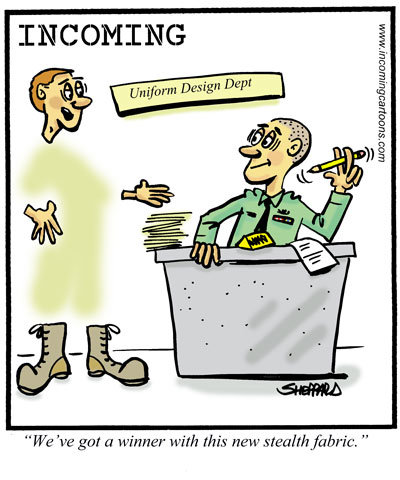 We’ve got stealth aircraft, stealth submarines so why not stealth uniforms? Wrap a helmet and boots in it in addition to the utilities and the foot soldier is virtually invisible. We could drastically reduce the number of troops needed.